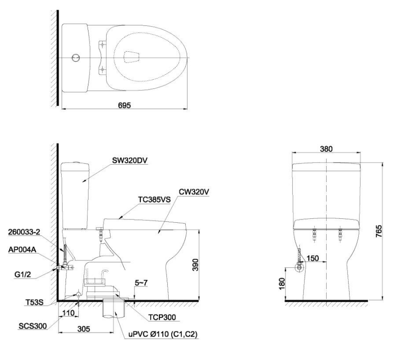 Bàn cầu hai khối kết hợp nắp đóng êm TC395VS , Hệ thống xả Siphon, tiết kiệm nước (4.8L/3L)