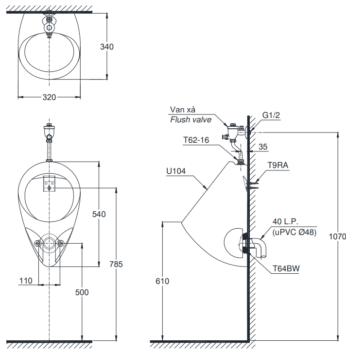 U104W/F#W: Tiểu nam treo tường , Đường cấp nước phía trên