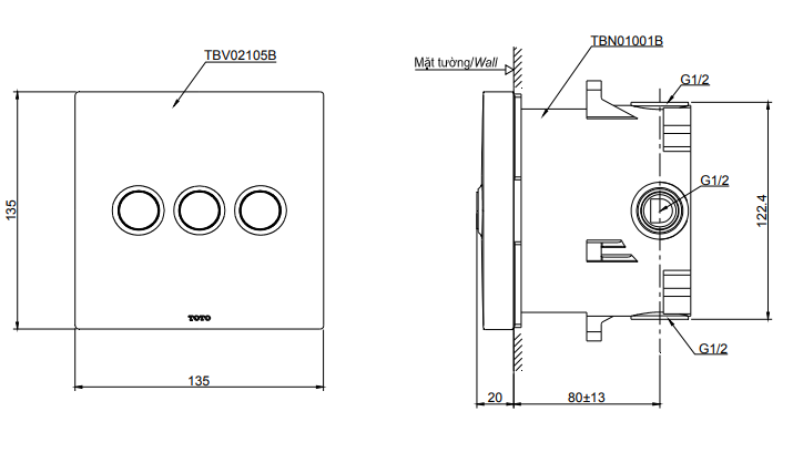 Van chuyển hướng (3 đường nước ra) (loại nút nhấn) kèm phụ kiện âm tường