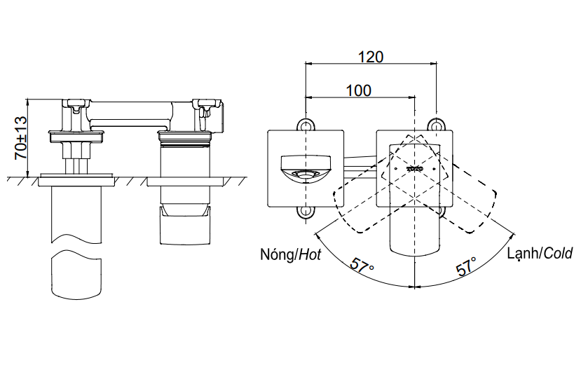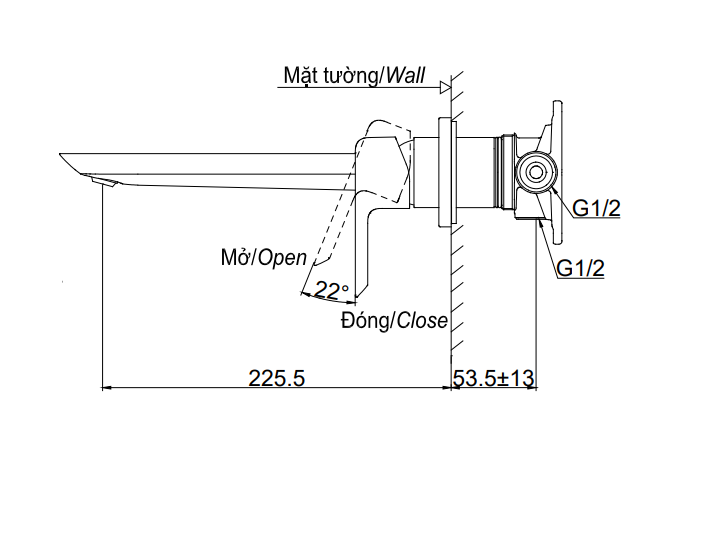 Vòi chậu gật gù nóng lạnh gắn tường GR (2 lỗ) , Kích thước vòi (từ tâm xả nước đến tường): 225.5mm