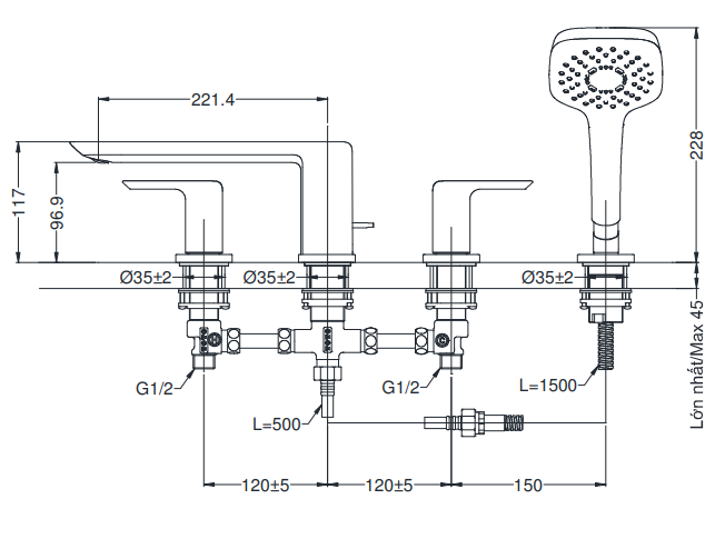 Vòi xả bồn nóng lạnh kèm sen tắm GB (4 lỗ)