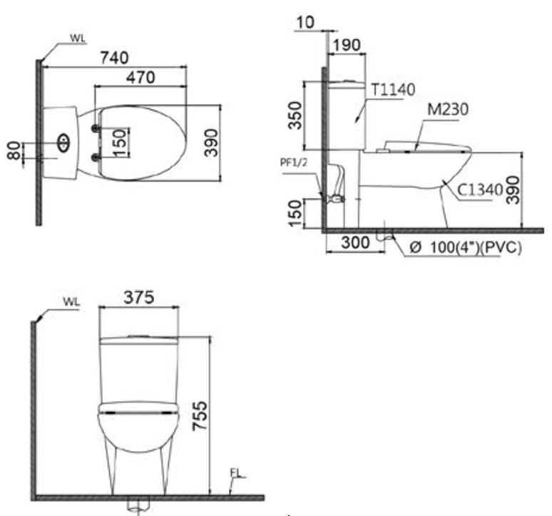 Bàn cầu 2 khối ( không nắp ) + Nắp rửa điện tử TAF400H