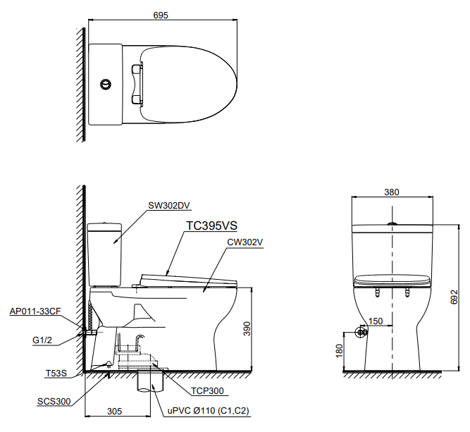 Bàn cầu hai khối kết hợp nắp đóng êm TC395VS , Hệ thống xả Siphon (4.8L/3L)