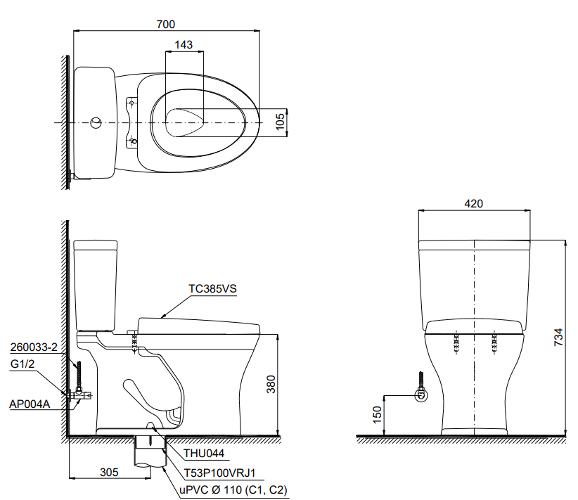 Bàn cầu hai khối kết hợp nắp đóng êm TC395VS , Men sứ chống dính CeFiONtect