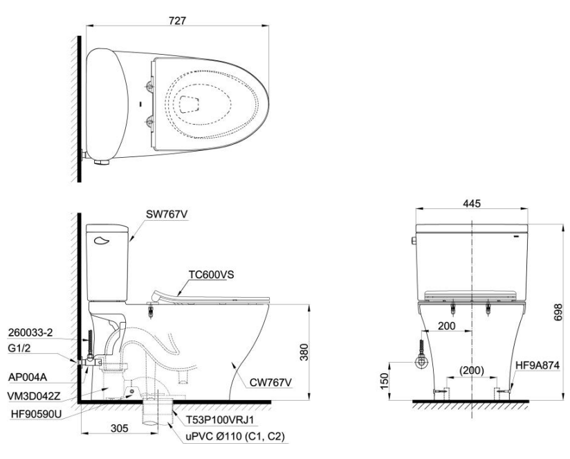 Bàn cầu 1 khối + nắp rửa điện tử-AC-1135+CW-KB22AVN/BW1