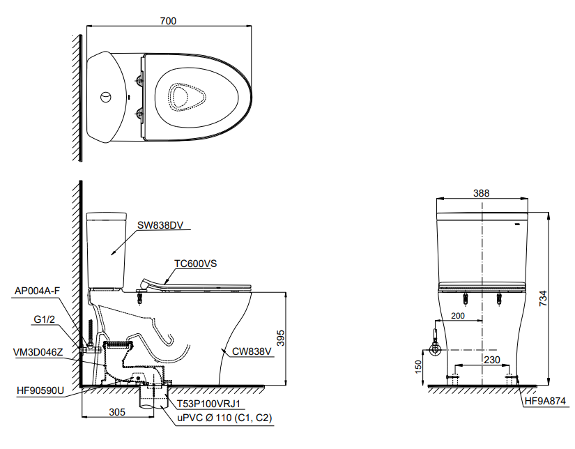 Bàn cầu hai khối, nắp đóng êm TC600VS , Men sứ chống dính CeFiONtect