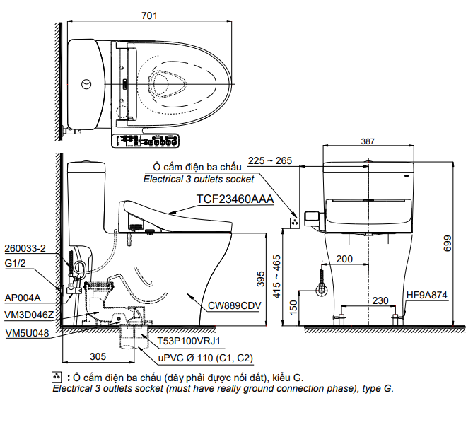 Bàn cầu một khối, kèm nắp rửa điện tử WASHLET (loại giấu dây) dòng C5 - TCF24460AAA (220V) , Men sứ chống dính CeFiONtect