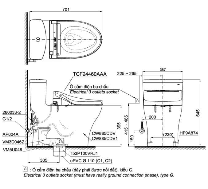 Bàn cầu một khối, kèm nắp rửa điện tử WASHLET (loại giấu dây) dòng C5 - TCF24460AAA (220V) , Men sứ chống dính CeFiONtect