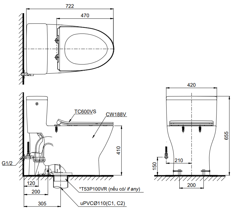 Bàn cầu hai khối, nắp đóng êm TC600VS , Men sứ chống dính CeFiONtect