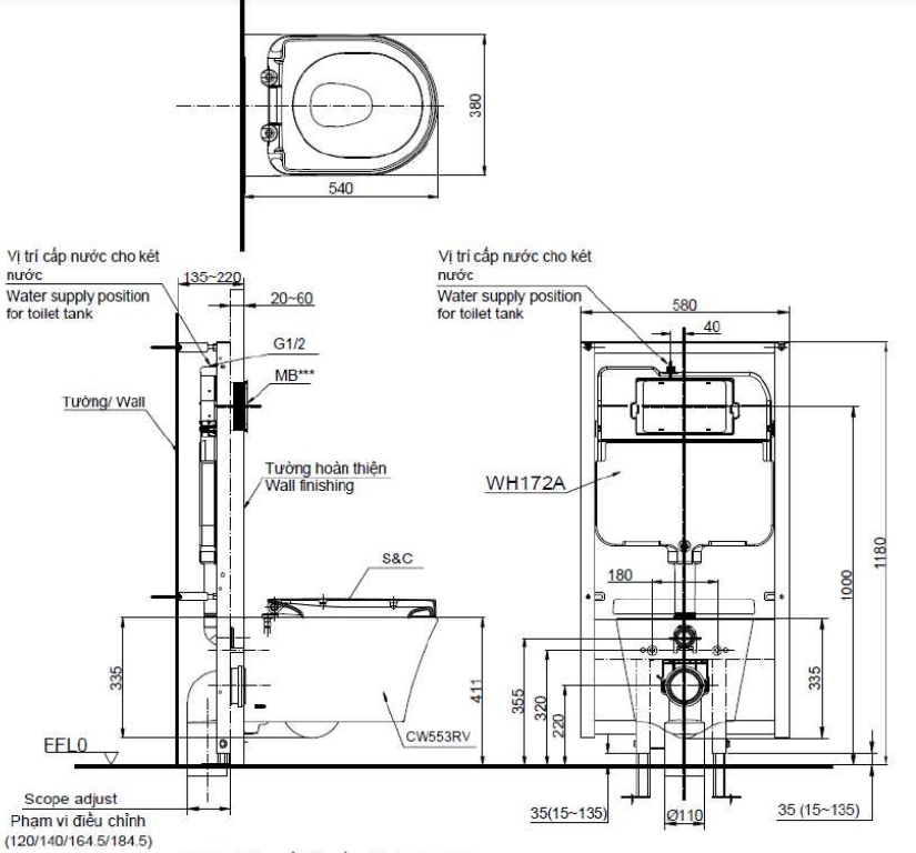 Bàn cầu treo tường giấu dây kết hợp nắp rửa điện tử WASHLET dòng S5 TCF34570GAA (220V) (có tự động xả) , Hệ thống xả Tornado hiệu quả, tiết kiệm nước (4.5/3L)