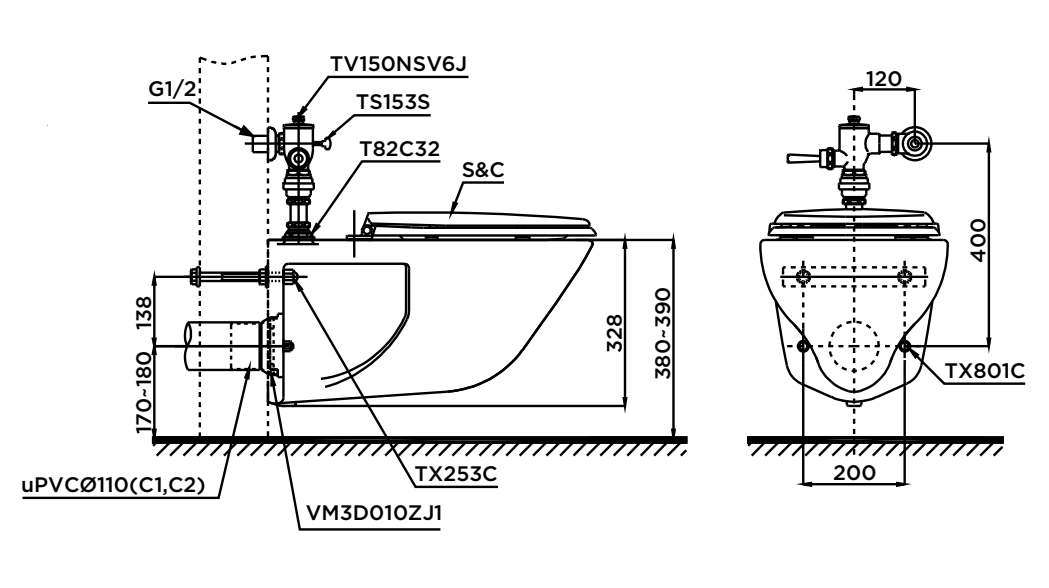 Bàn cầu treo tường, nắp đóng êm TC393VS (chốt dừng TS153S) , Men sứ chống dính CeFiONtect