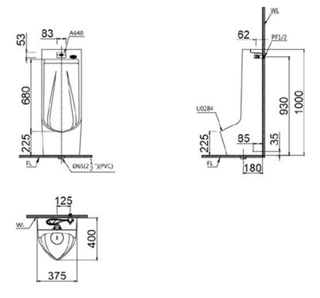 Bệ tiểu nam đặt sàn - đường nước cấp phía sau (Gồm bộ cảm ứng A640)