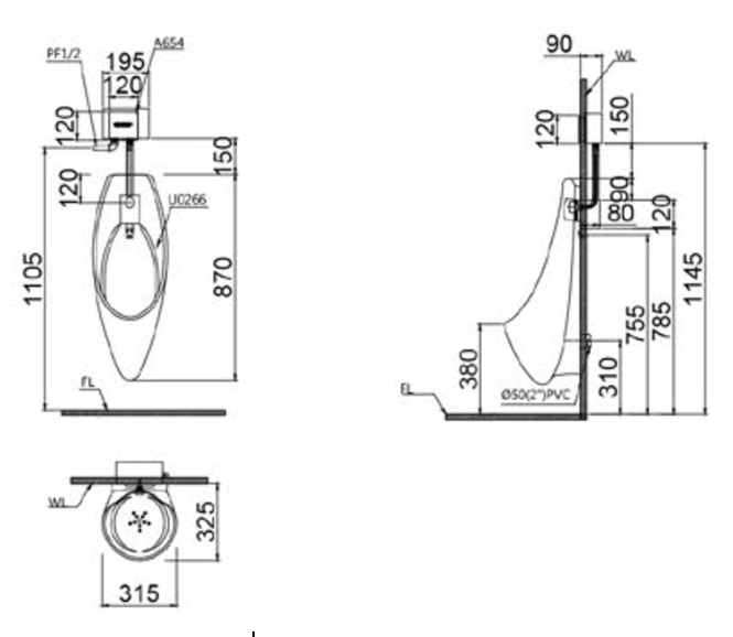 Bệ tiểu nam treo tường - đường nước cấp phía sau