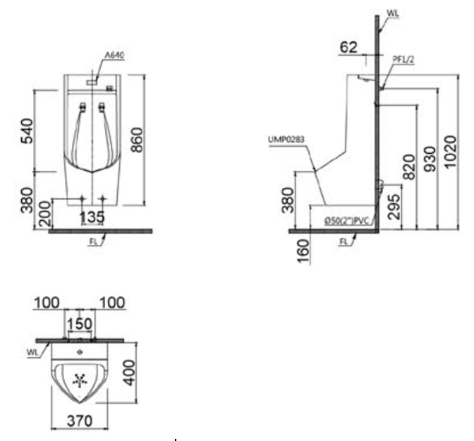 Bệ tiểu nam treo tường - đường nước cấp phía sau (gồm bộ cảm ứng A640)
