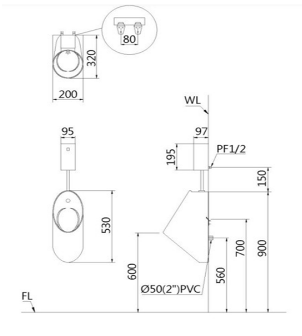 Bệ tiểu nam treo tường - đường nước cấp phía trên