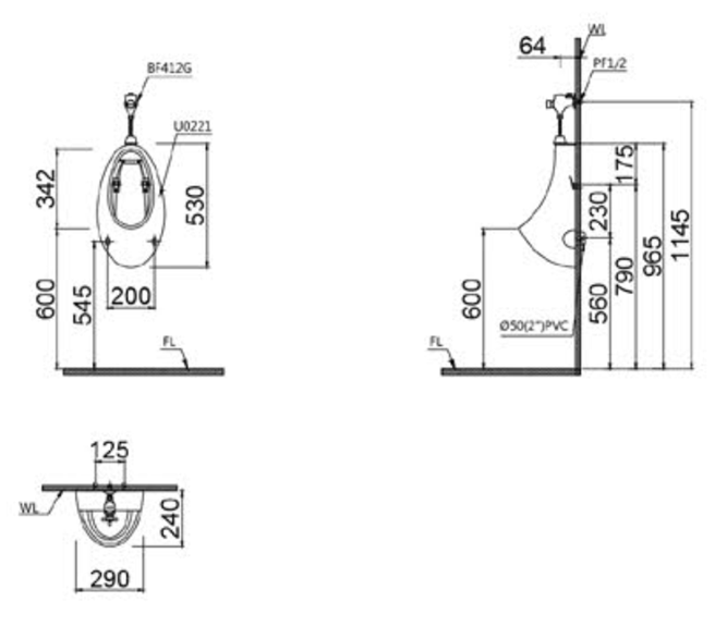 Bệ tiểu nam treo tường - đường nước cấp phía trên