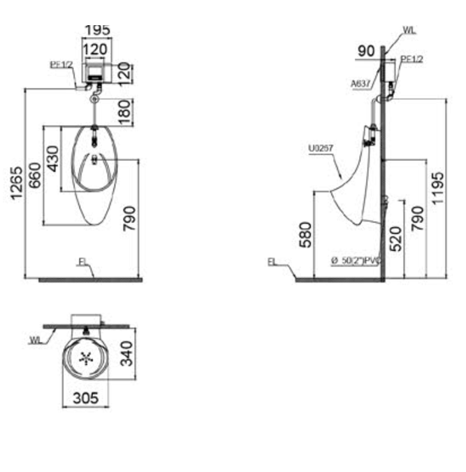 Bệ tiểu nam treo tường - đường nước cấp phía trên