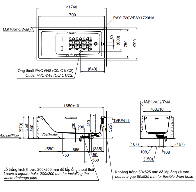 Bồn tắm nhựa không tay vịn, không yếm , Bộ xả nhấn kèm ống thải bồn tắm: TVBF411