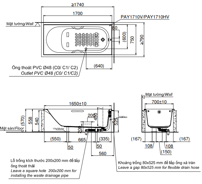 Bồn tắm nhựa không tay vịn, không yếm , Bộ xả nhấn kèm ống thải bồn tắm: TVBF411