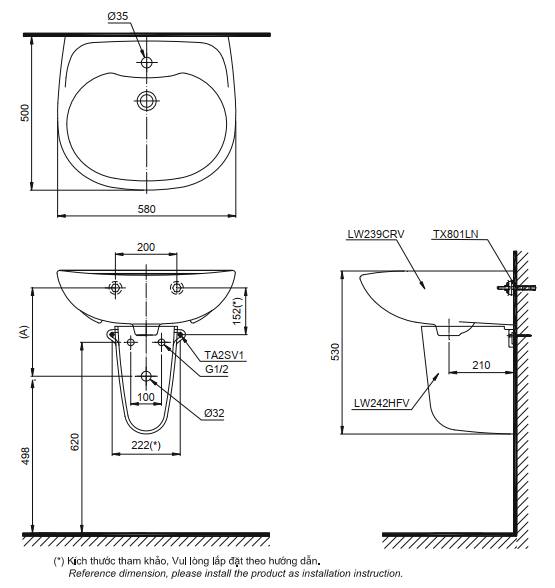 Chậu chân lửng , Kích thước: L500 x W580 x H530 (mm)