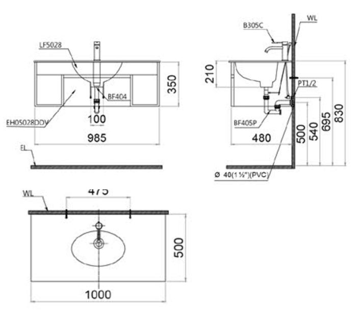 Vòi chậu gật gù nóng lạnh gắn tường GE (2 lỗ) , Kích thước vòi (từ tâm xả nước đến tường): 258.3 mm