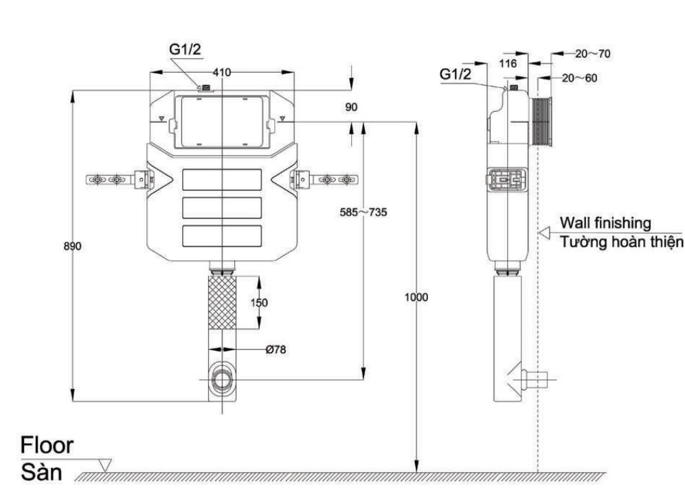 Két nước âm tường, xả nhấn 2 chế độ 6/3L ,