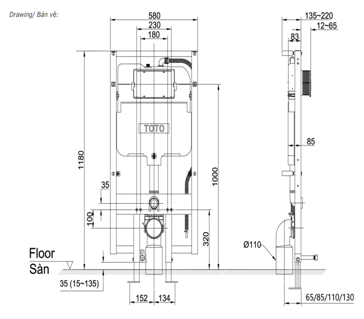 Két nước & khung âm tường kèm ống thải cong , Xả nhấn 2 chế độ 4.5/3L