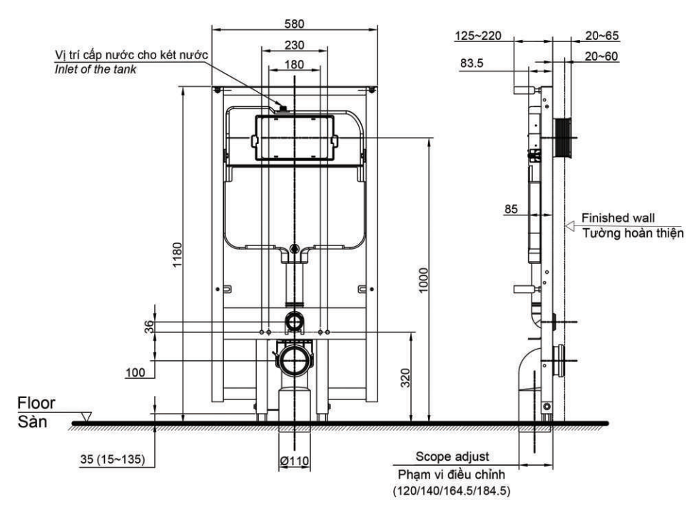 Két nước & khung âm tường kèm ống thải cong , Xả nhấn 2 chế độ 6/3L