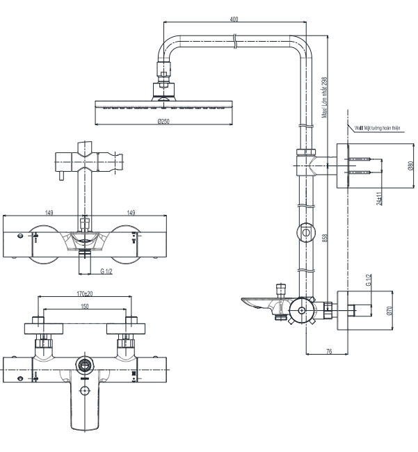Sen cây nhiệt độ kèm vòi xả bồn dòng G, dáng bát sen tròn 1 chế độ, mặt kim loại , Đường kính bát sen: 250mm