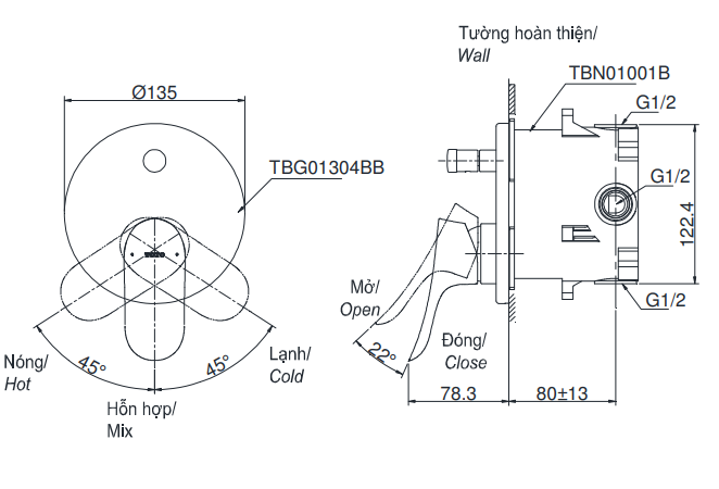 Van gật gù điều chỉnh nóng lạnh GO kèm nút chuyển hướng và phụ kiện âm tường