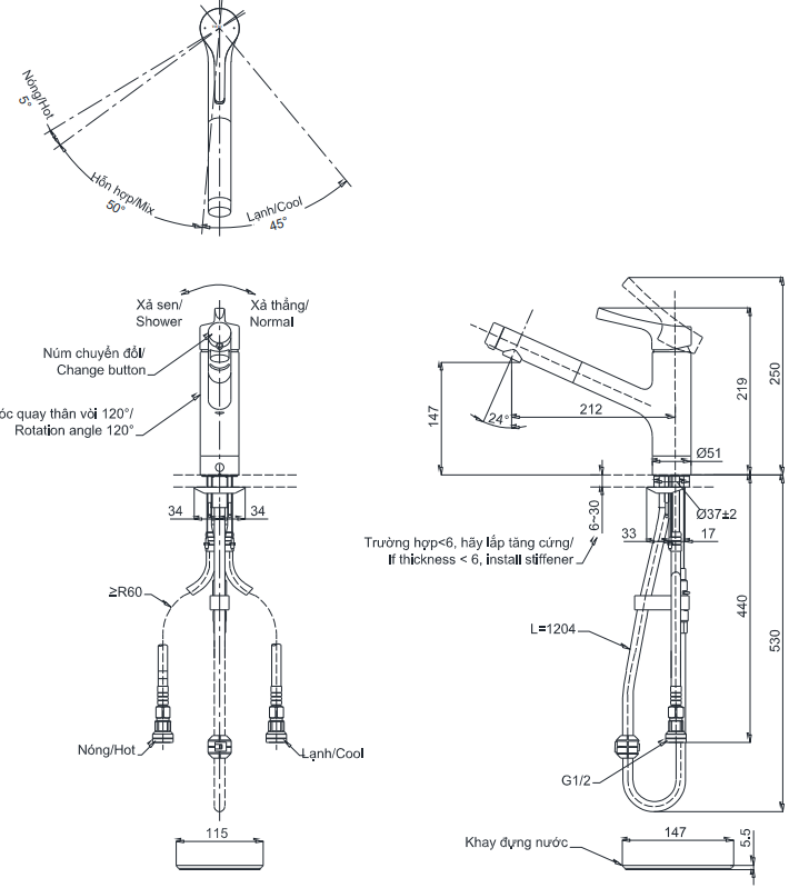 Vòi bếp gật gù có dây rút 2 chế độ , Chất liệu: Đồng mạ Ni-Cr