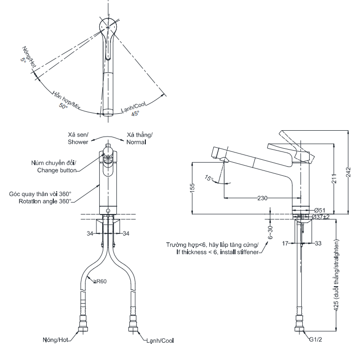 Vòi bếp gật gù nóng lạnh 2 chế độ , Chất liệu: Đồng mạ Ni-Cr