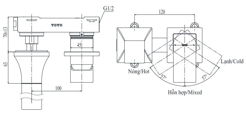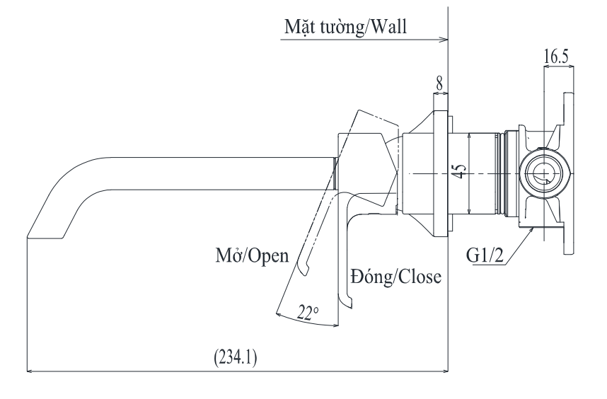 Vòi chậu gật gù nóng lạnh gắn tường GC (2 lỗ) , Kích thước vòi (từ tâm xả nước đến tường): 234.1 mm