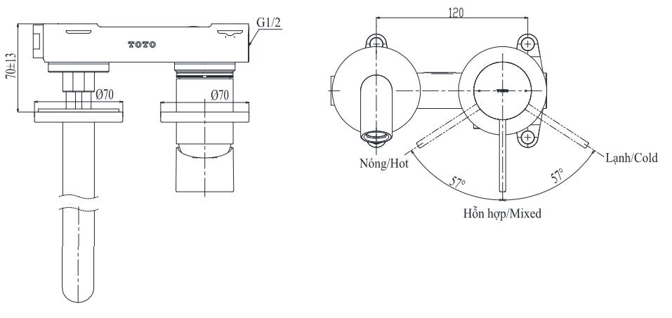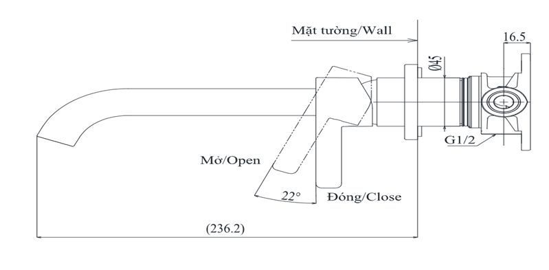 Vòi chậu gật gù nóng lạnh gắn tường GF (2 lỗ) , Kích thước vòi (từ tâm xả nước đến tường): 236.2 mm