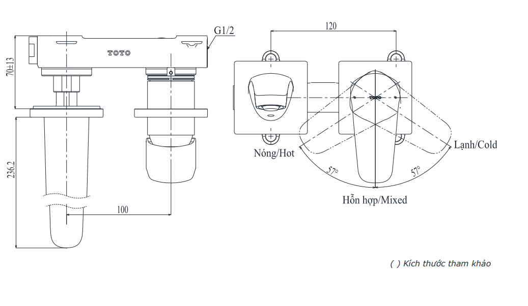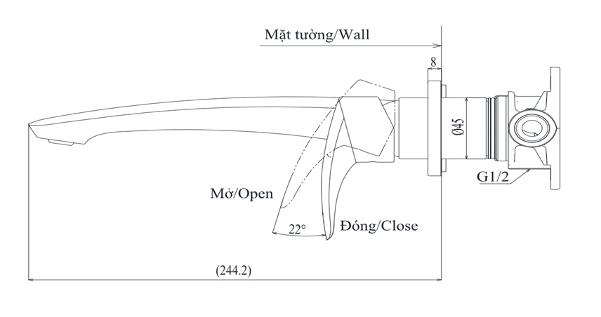 Vòi chậu gật gù nóng lạnh gắn tường GM (2 lỗ) , Kích thước vòi (từ tâm xả nước đến tường): 244.2 mm