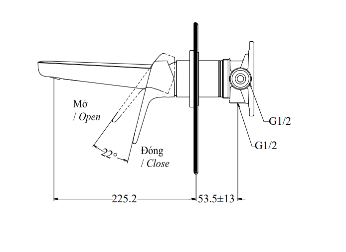 Vòi chậu gật gù nóng lạnh gắn tường GS (2 lỗ) , Kích thước vòi (từ tâm xả nước đến tường): 225.2mm