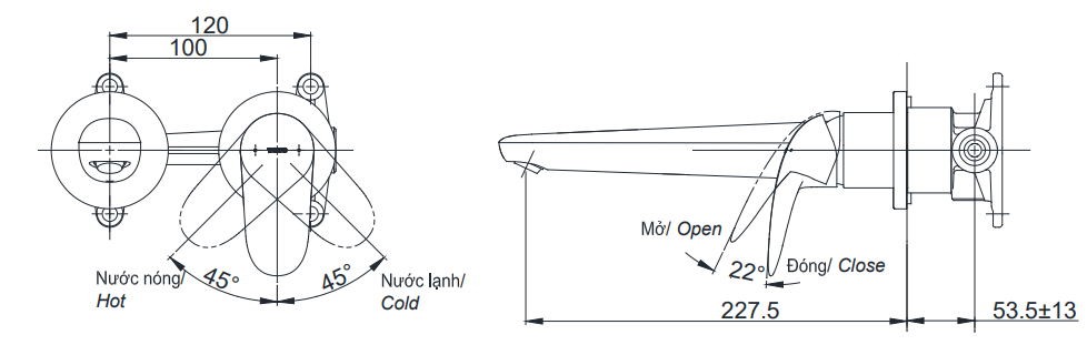 Vòi chậu gật gù nóng lạnh gắn tường LC (2 lỗ) , Kích thước vòi (từ tâm xả nước đến tường): 227.5mm