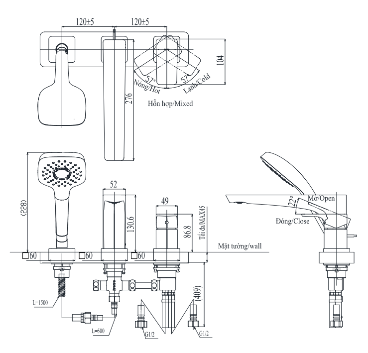 Vòi xả bồn nóng lạnh kèm sen tắm GM (3 lỗ) , Mã cũ: TBG09305A