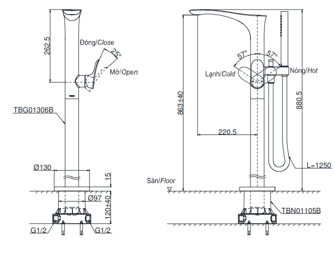Vòi xả bồn nóng lạnh kèm sen tắm GO (loại đặt sàn) (kèm đế)