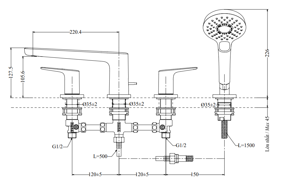 Vòi xả bồn nóng lạnh kèm sen tắm GS (4 lỗ) , Mã hàng cũ: TBG03202B, TBG03202BA