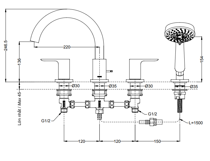 Vòi xả bồn nóng lạnh kèm sen tắm LB (4 lỗ) , Mã cũ: TBS01202B